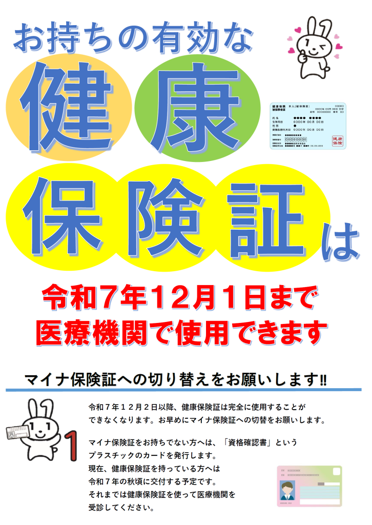 現在、健康保険証をお持ちの方は令和7年12月1日まで使用できますので、返却したり捨てたりせずそのままご使用ください。